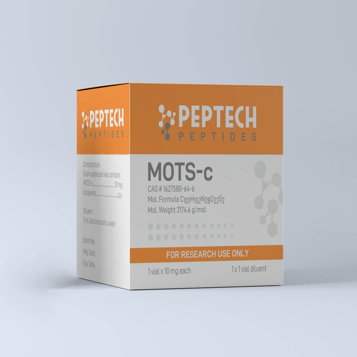 MOTS-c is a mitochondrial-derived peptide, and the Peptech MOTS-c Research Peptide is supplied with complete chemical identification details displayed on the packaging. These include the CAS number, molecular formula, and molecular weight, ensuring transparency and traceability for research records. Such detailed labelling supports accurate referencing in experimental design and peptide-related studies.